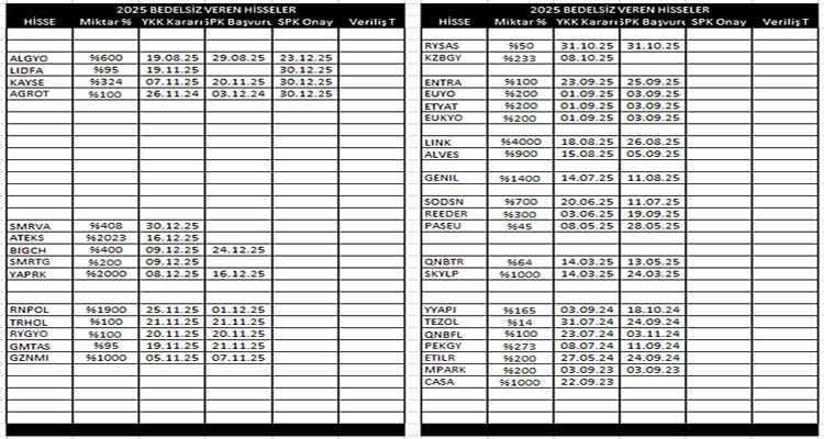 SPK 2025 yılında 85 hisseye bedelsiz bölünme izni verdi. 2025 yılında Eylül ayı 15 hisseyle bedelsiz rekoru kırdı. Mayıs 2025 ile Temmuz 2025 3 er adet ile en az bedelsiz bölünü hisseler oldu.